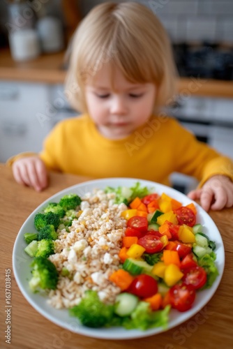 toddler exploring healthy homemade food in a bright kitchen interior, playful mealtime setup, vertical composition