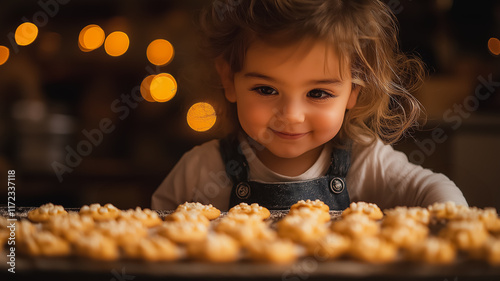 Toddler's Delight: A charming toddler gazes intently at a tray of freshly baked cookies, her expression a mix of wonder and anticipation in a heartwarming, intimate scene.