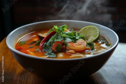 thai, soup, shrimp, cilantro, mushroom, tomatoes, rustic, photorealistic, ingredient, bowl, spicey, broth, lime, lemongrass, chili, vibrant, aromatic, creamy, hot, herb, authentic, cookery, thai food, coriander, ginger, zest, lemony, savoury, seafood, exotic, epicure, fresh, traditional, asian, flavorful, appetising, comforting, table, spice, garnish