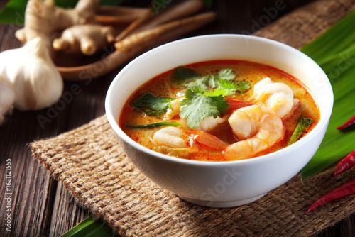Tom Yum Goong (Thai spicy shrimp soup) served in a white bowl with traditional Thai herbs and garnishes background