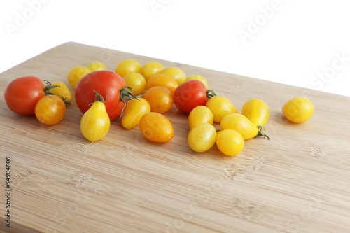 tomatoes, small, lot, vegetable, red, yellow, ripe, fresh, chopping board, release, isolated, angular, oblique, fall