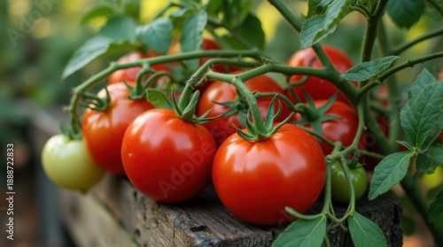 Tomatoes on plant, illustrating harvesting for food preparation
