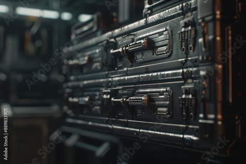Tool chests are presented in ultramodern, supernatural scenes, with copy space, featuring intelligent storage solutions and digital inventory systems for seamless organization