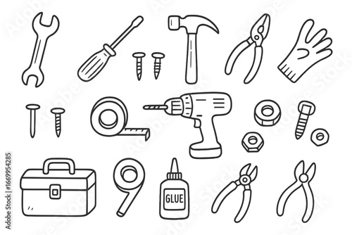 tool, doodle, icon, hand, drawn, illustration, repair, wrench, screwdriver, hammer, plier, nail, screw, drill, tape, measure, bolt, nut, safety, glove, toolbox, glue, wire, cutter, simple, cartoon, style