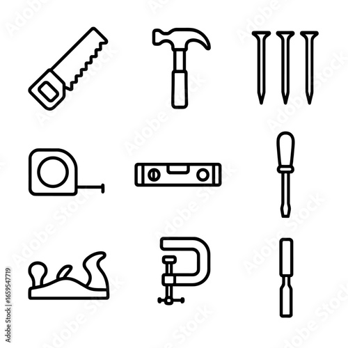 tool, icon, set, outline, board, tool, saw, hammer, nail, measuring, tape, level, screwdriver, planer, clamp, chisel, line, icon, only, black, colours, consistent, stroke, weight, across, all