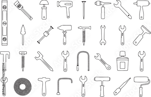 tool, hardware, wrench, hammer, level, screw, nail, drill, rope, plier, screwdriver, clamp, measuring tape, construction, bricolage, workshop, metal, wood, repair, maintenance, collection, assortment, graphic, illustration, outline, black-and-white, line art, vector, simple, clean, design, equipment, supply