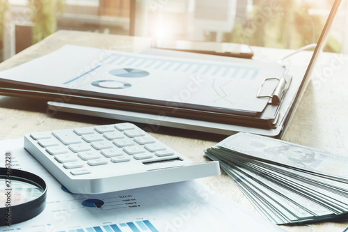 Tools Business Financial, focus white calculator with budget and financial document paper on wood desk in office room.