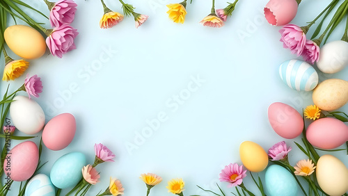 Top down view of an Easter border frame of eggs with copy space in the middle