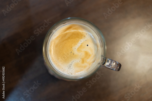 Top view, a cup of coffee on wooden table with work break time, food concept. Close up of a glass of hot espresso mix Soft drink with copy space