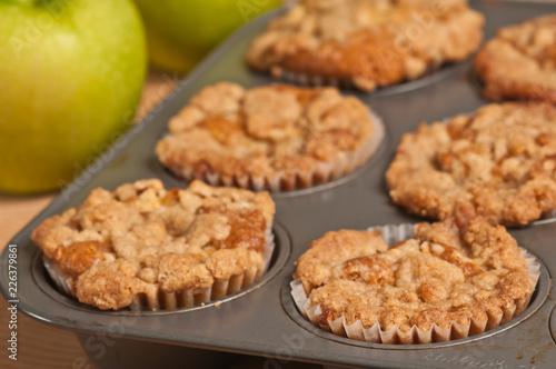 Top view, close up of six, freshly baked, homemade apple crumb muffins cooling in teflon, metal, cup cake baking sheet and two green apples