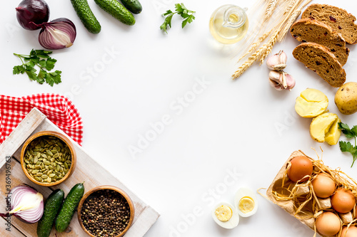 Top view frame of dinner table with fresh homemade food - effs, bread, potatoes