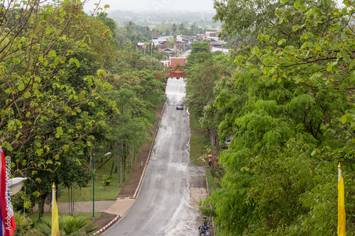 asia, asian, car, green, nature, park, rain, road, street, temple, topview, town, tree, village, wet