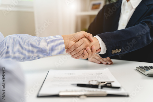 Top view hands of agent and client shaking hands after signed contract buy new apartment.