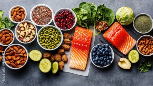 Top view of a colorful variety of nutritious foods, including leafy greens, salmon, almonds, and berries on a concrete surface. Ideal for health-focused designs.
