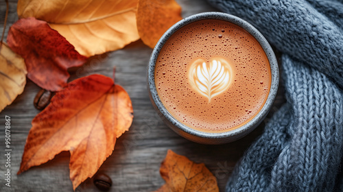 Top view of a cup of coffee and foam with a heart painted on it. Next to the cup is a knitted blue sweater and yellow autumn leaves, an empty space for text.