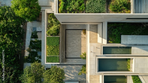 Top view of a modern Indian wellness center with minimalist design and rooftop gardens