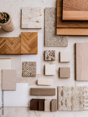 Top view of an interior design mood board in natural tones. Minimalist composition with fabric samples, color palette, and material textures inspired by nature.