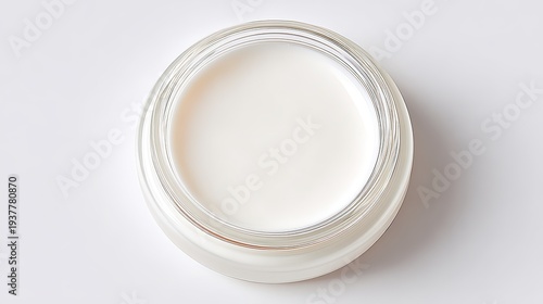 Top view of an open glass jar containing smooth white cosmetic cream or lotion product