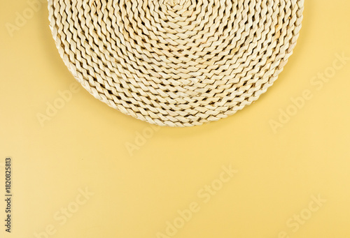 Top view of brown wicker table mat on yellow background. Straw round tray, flat lay, copy space.