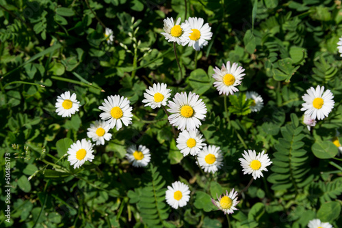 Top view of daisy flowers in a meadow on a sunny spring day. Natural background concept. Close up, selective focus