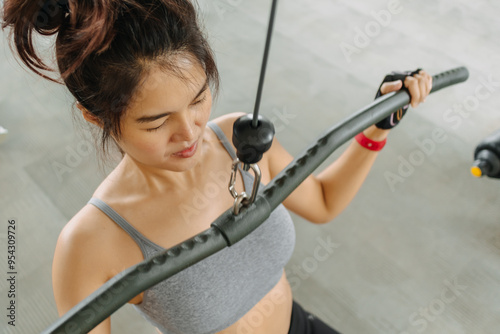 Top view of fitness asian Thai woman focused using cable pull-down for back and arms exercise, get fit and firm at gym at day time.