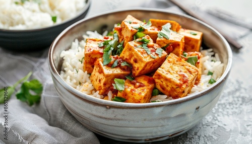 Top view of Korean tofu dubu jorim in a gray bowl with rice and a light background representing Asian vegetarian food
