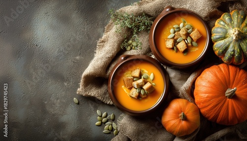 soup, pumpkin, table, food, crouton, cream, white, carrot, yellow, autumn, seasonal, spicey, organic, delicious, healthy, warm, seed, squash, vegetable, ingredient, view, top, space, copy, lay, overhead, blank, mock, fall, harvest, thanksgiving, cosy, festive, eat, cook, meal, receipe, dish, favor, creamy, fresh, savoury, natural, kitchen, cookery, nourish, nourishment