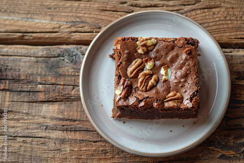 Top view of square chocolate brownie with nuts on a white plate over a wooden table
