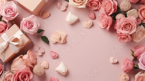 Top View of Valentine day banner design of a collection of Gift box and pink flowers on pink pastel background