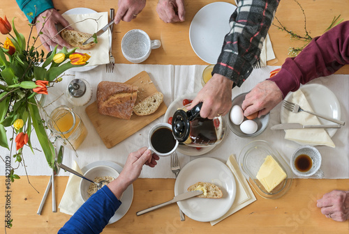 Top view on a group of people sitting on a wooden table and having breakfast together with coffee, bread, eggs, butter and some spring flowers, high angle view from above