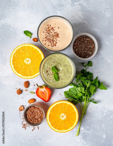 smoothie, drink, food, healthy, fruit, fresh, beverage, nourishment, glasses, orange, diet, vitamin, raw, vegan, breakfast, ingredient, mint, table, top, view, still, life, delicious, refreshment, antioxidant, vegetarian, studio, shot, flat, lay, grey, background, natural, strawberry, parsley, sweet, health, citrous, seed, plant, overhead, flax, bowl, receipe, colourful, clean, eating