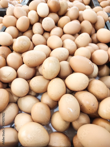 Top-angle shot of raw eggs arranged in disarray. Chicken eggs displayed and sold in a supermarket. Abstract Textured Backgrounds. Pile of Eggs. Graphic Resources. Negative space.