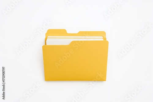 Top-down view of a yellow folder containing papers on a white background