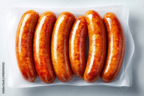 sausage, cooked, meat, tray, food, packaged, brown, grilled, prepared, top, view, fresh, delicious, tasty, deliciously, arrangement, display, horizontal, close, up, crispy, ready, foodstuff, preparation, wrapped, cardboard box, pale, white, surface, light, background, row, even, texture, slice