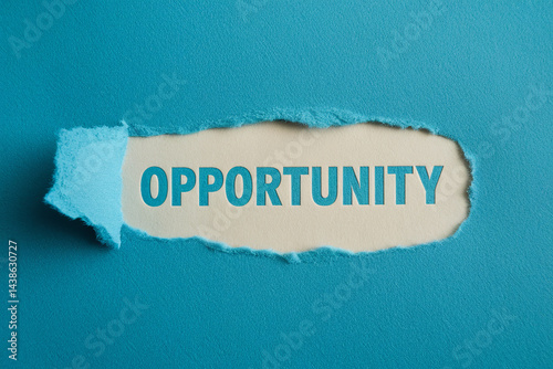 Torn blue paper revealing beige background with the word OPPORTUNITY in blue, symbolizing new beginnings and potential