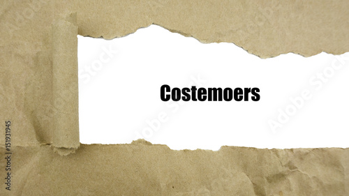 Torn brown paper on white surface with "costemoers" word.