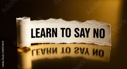 learn, say, no, message, text, word, quote, phrase, torn, paper, disrobed, white, black, bold, lettering, typography, mirrored, surface, dark, background, textured, dramatic, lighting, studio, shot, closeup, macro, concept, idea, decision, boundary, personal, growth, assertiveness, empowerment, independence, refusal, rejection, setting, limit, advice, guidance, wisdom, communication, psychology, motivation, inspiration