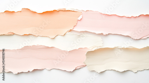 Torn paper strips in pastel shades of peach, pink, and cream on a white background.