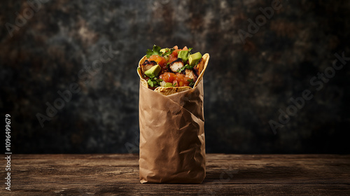 Tortilla wrap with grilled chicken and vegetables in kraft paper