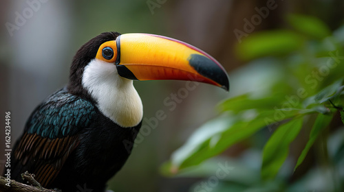 Toucan with vibrant yellow-orange beak and black body in lush green habitat