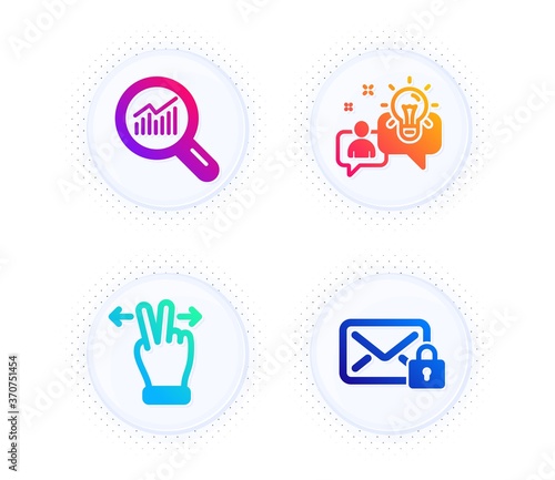 Touchscreen gesture, Data analysis and Idea icons simple set. Button with halftone dots. Secure mail sign. Swipe, Magnifying glass, Solution. Private e-mail. Technology set. Vector