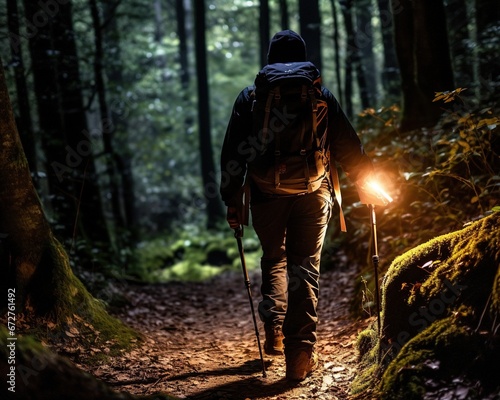 holiday maker, with, backpack, and, hiking, stick, walk, flashlight, dark, travelling