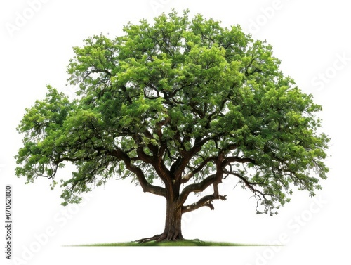 towering ancient oak tree isolated on white background intricate branches and lush green foliage create a striking silhouette perfect for environmental and naturethemed designs