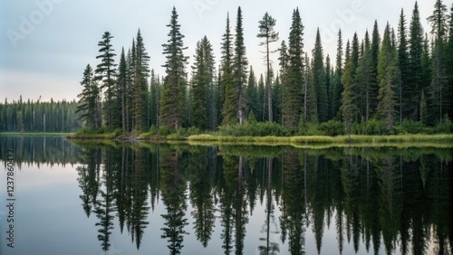 Towering pine trees reflected in the mirror-like surface of a still lake, lake reflections, serene atmosphere, countryside charm