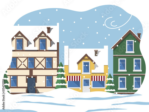 Town with old buildings and architecture in winter. Cityscape with snowing weather and bad conditions. Snowfall and wind in city. Roads covered with snow. Seasonal views, vector in flat style