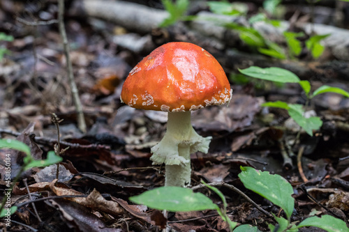 Toxic and hallucinogen mushroom Fly Agaric in grass on autumn forest background. Red poisonous Amanita Muscaria fungus macro close up in natural environment. Inspirational natural fall landscape