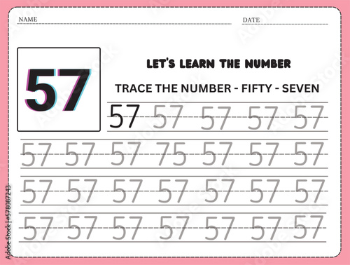 Trace and write the number 57. Handwriting practice. Learning numbers for kids. Education developing worksheet. Activity page.