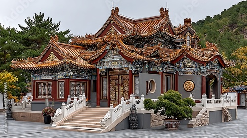 Traditional asian temple with ornate architecture and lush greenery high resolution photo