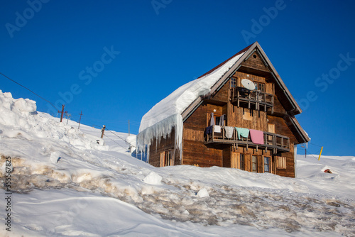 traditional beautiful wooden house - wintry scene with snowy hut on a ski resort