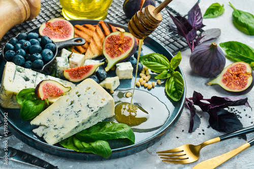 Traditional blue cheese, figs, blueberries and honey in a plate. On a concrete background. Side view.